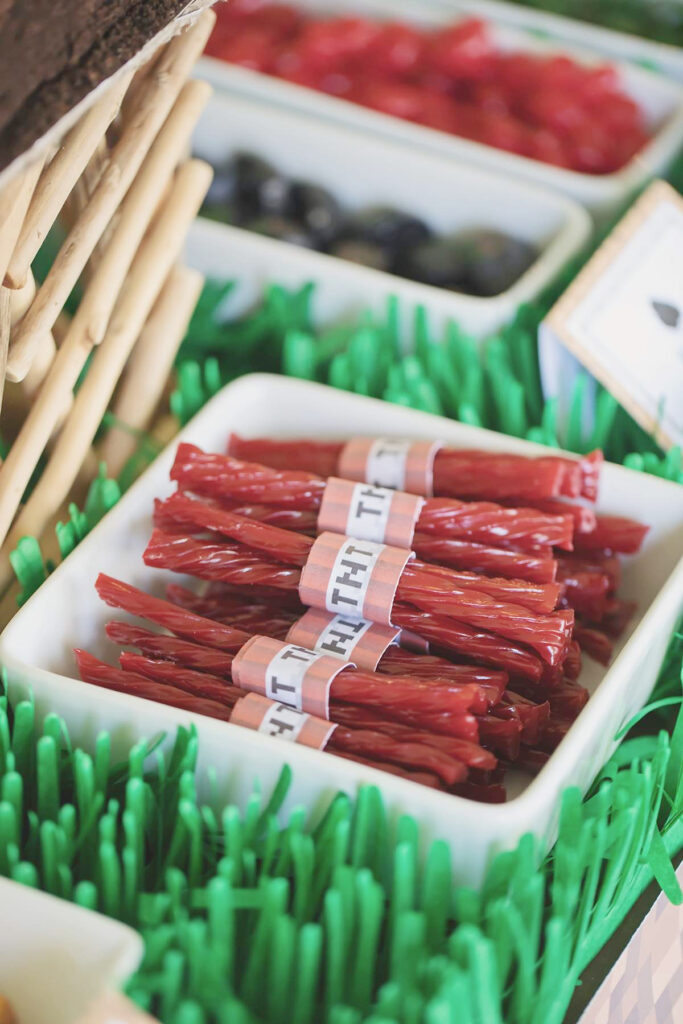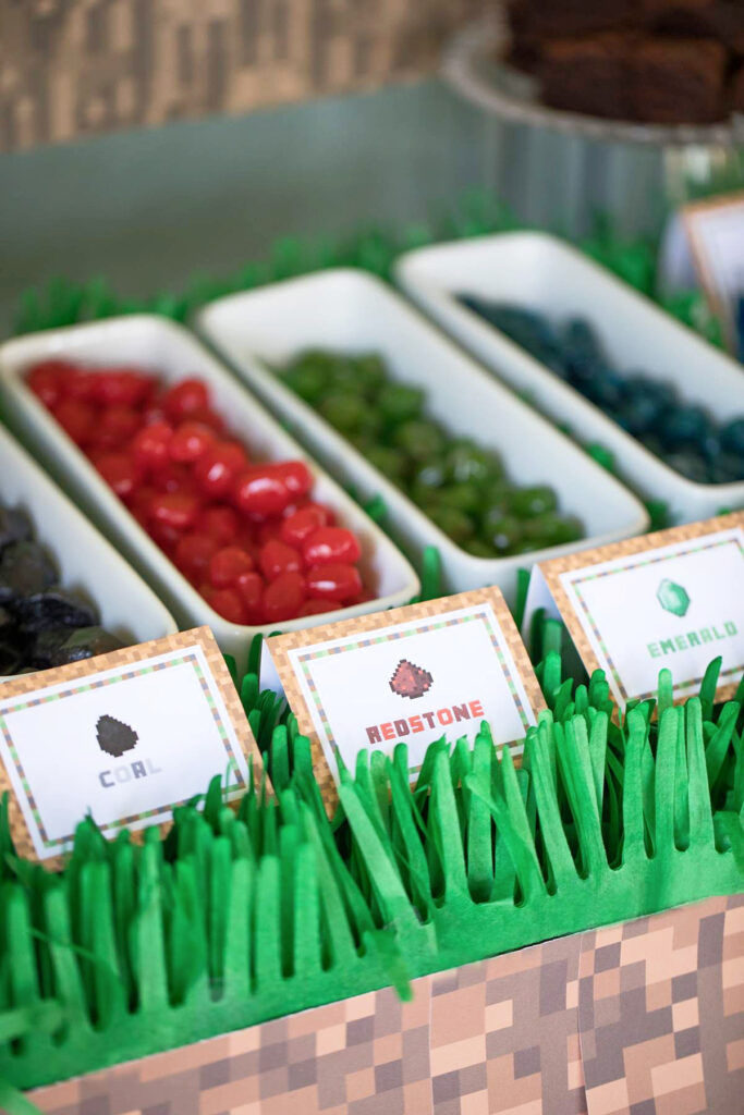 Wrap red gummy candies in “TNT” labels, stacked in a pyramid on a table. Surround with red streamers for an explosive, Minecraft-inspired candy display.