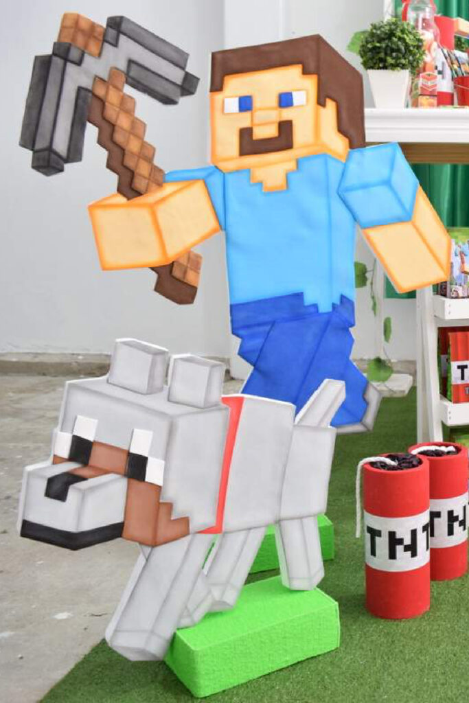 Create a dessert table with a green tablecloth, topped with Creeper cupcakes and TNT candies. Add a “Minecraft Sweet Biome” sign for a cohesive, sugary display.