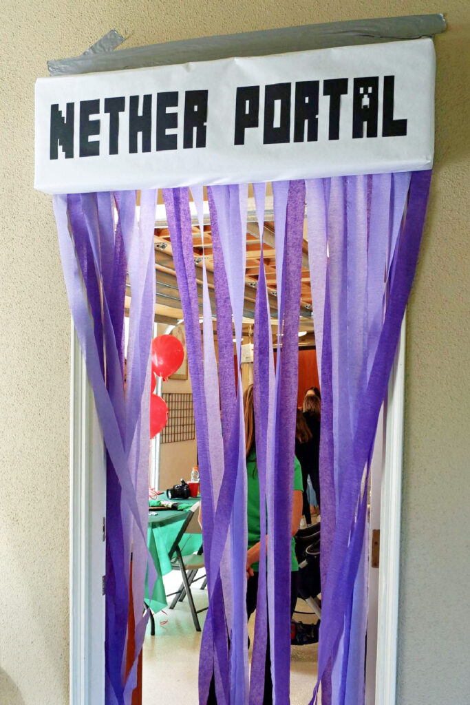 Craft a Nether Portal entrance using black and purple streamers with LED lights. Hang over the party entrance for a mystical, blocky gateway to adventure.