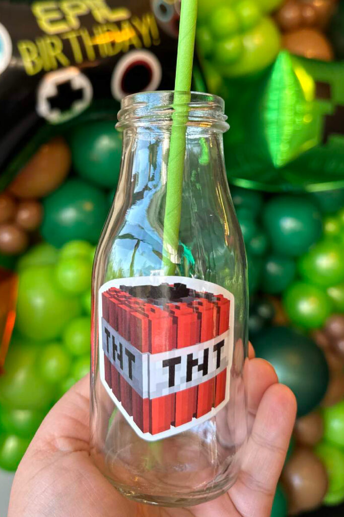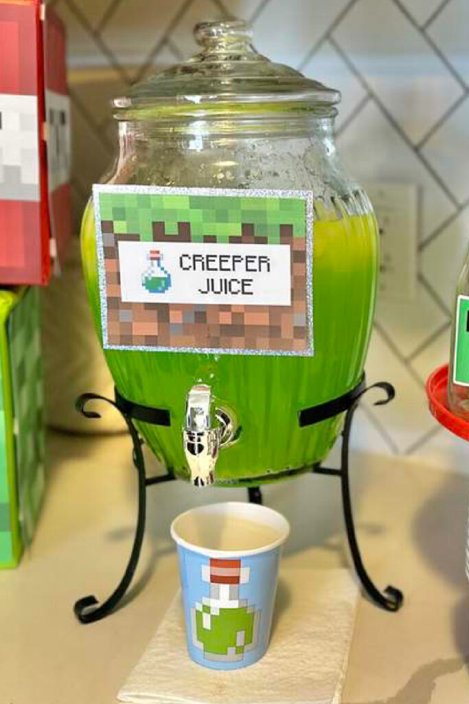 Serve green limeade in bottles labeled “Creeper Juice,” tied with pixelated green ribbons. Set on a table with a checkered runner for a fun, explosive drink corner.