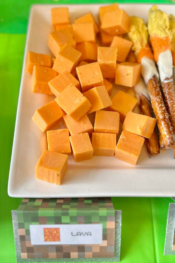 Serve cubed cheese in red and orange hues, arranged like flowing lava on a black platter. Add a “Magma Cube Snack” sign for a fiery, Minecraft-inspired treat.
