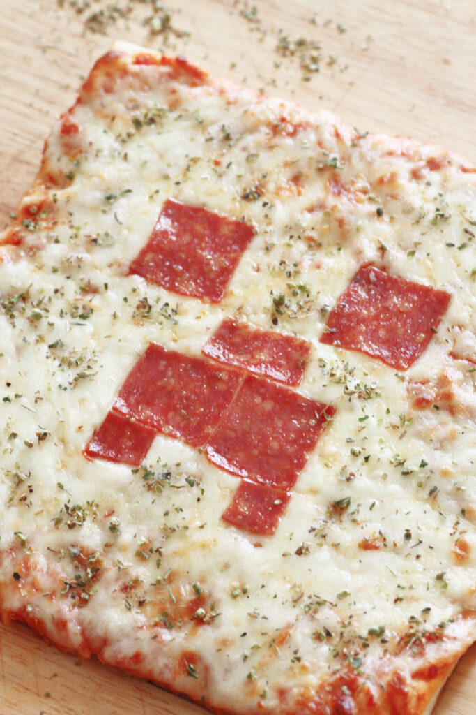 Make pizzas with green pepper “Creeper” faces, served on a table with a “Creeper Cafe” sign. Add pixelated napkins for a savory, game-themed snack display.