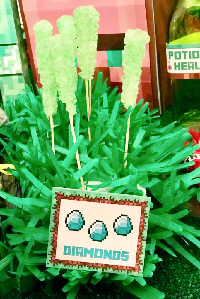 Craft rock candy sticks in blue and green, presented as “Minecraft Gems” in a wooden crate. Add a “Diamond Mine” label for a sweet, thematic centerpiece.