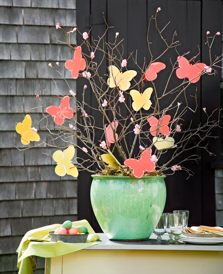 Decorate a small outdoor tree with butterfly-shaped ornaments in pastel colors, paired with fairy lights. This delicate, spring-inspired display adds whimsy to your Easter garden.