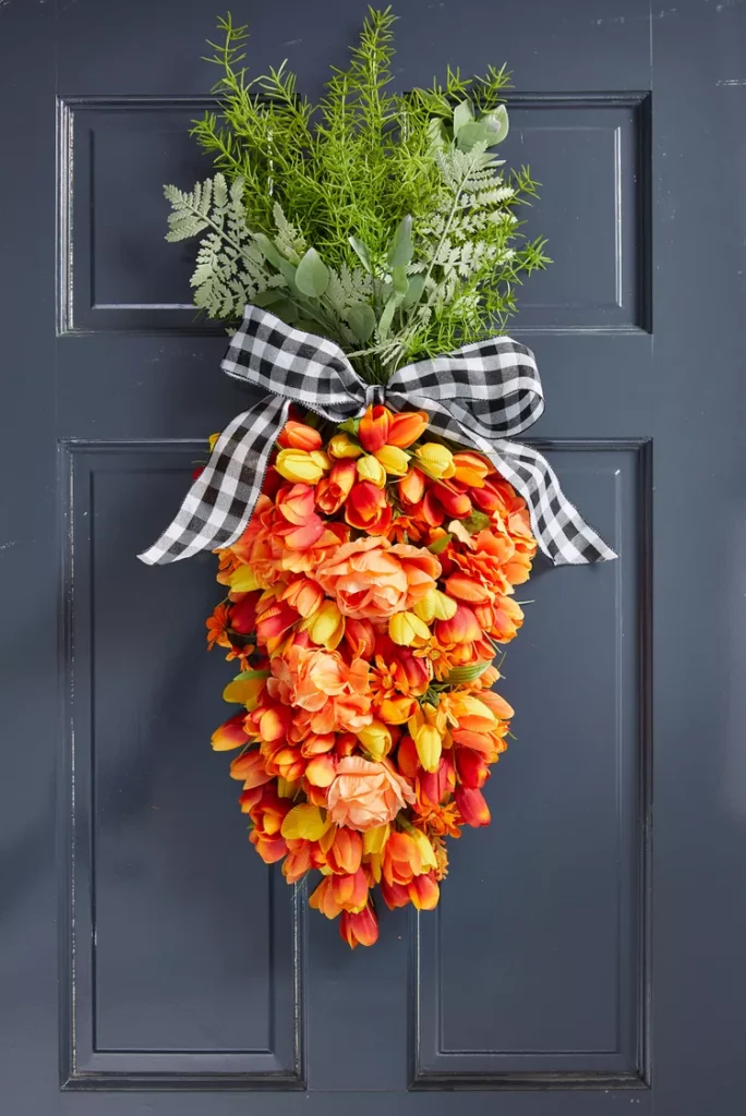 Combine orange tulips and green foliage to mimic carrots in a wreath, hung on a porch post. This playful design adds a unique, veggie-inspired Easter charm.