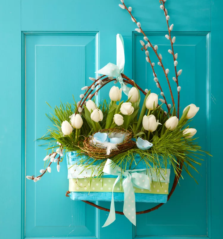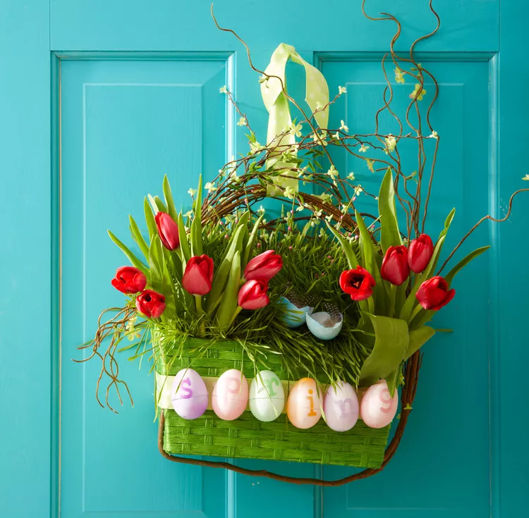 Adorn a wreath with vibrant tulips in red, yellow, and white, tied with a pastel ribbon. Hang on your front door for a classic, springtime Easter welcome.