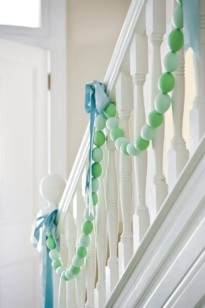 Drape garlands of pastel eggs along garden paths or porch railings, mixed with green vines. This cheerful accent guides guests through your festive Easter setup.