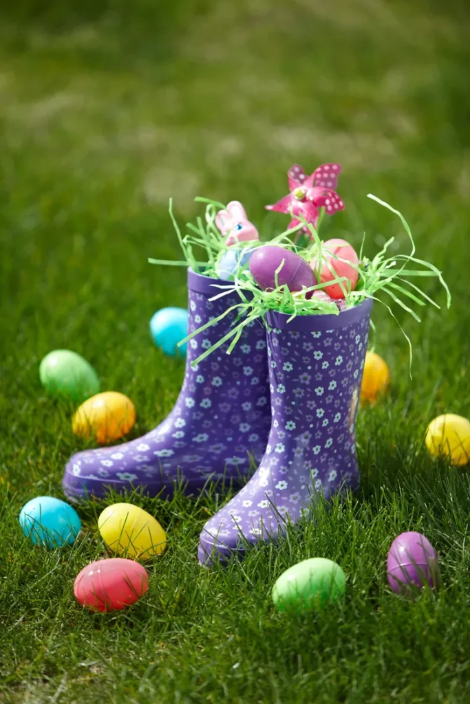 Fill colorful rain boots with faux grass and oversized plastic eggs, placed near your doorstep. Add a ribbon bow for a playful, weather-resistant Easter decoration.