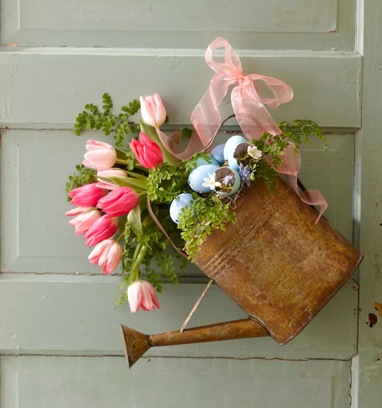 Fill a metal pail with pink and purple blooms, wired into a wreath shape. Hang on a garden hook or lean against a porch step for a charming, rustic Easter vibe.
