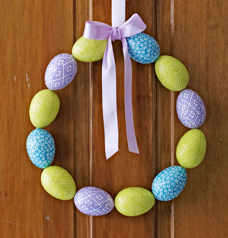 Craft a wreath from foam eggs painted in bright pastels, layered on a grapevine base. Add green moss for texture, perfect for hanging on your door or garden fence.