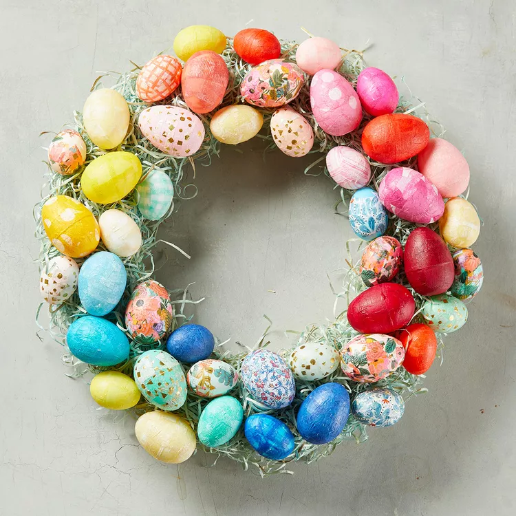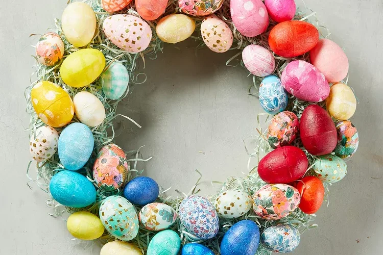 Create a bold wreath with multicolored eggs on a foam base, accented with ribbons and greenery. Hang on your front door for a vibrant, eye-catching Easter celebration.
