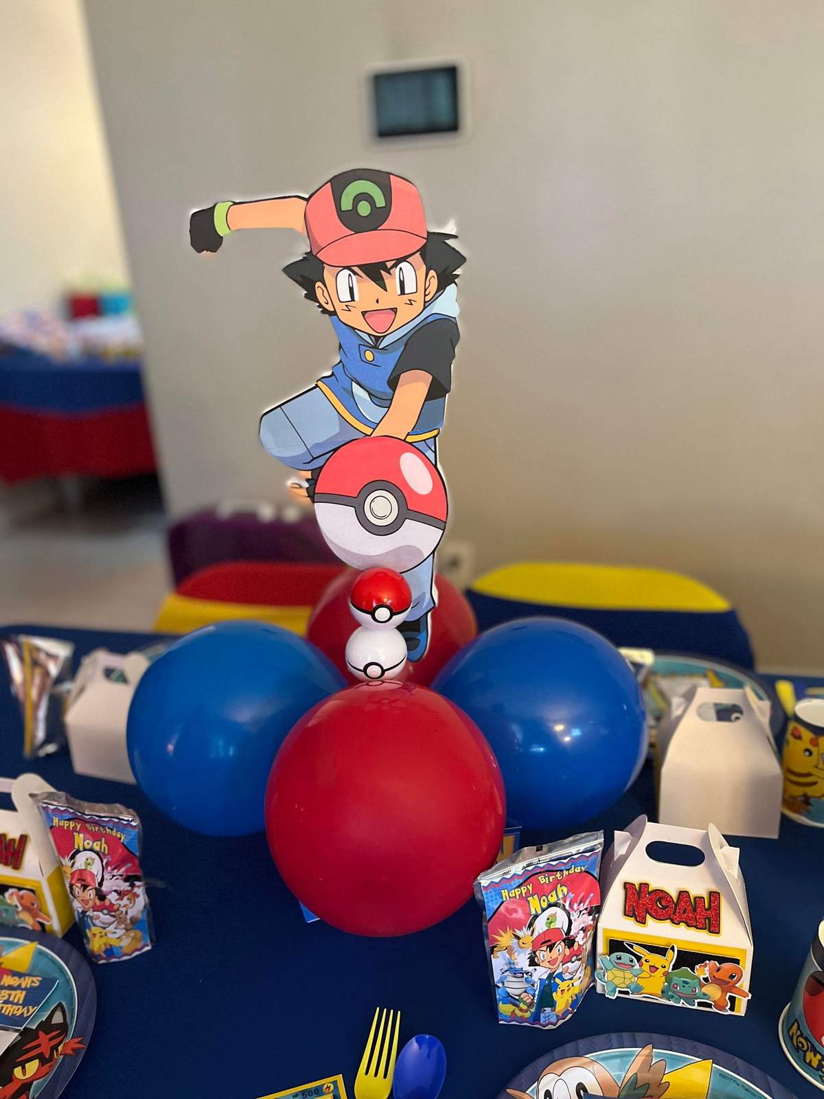 Create a centerpiece with an Ash Ketchum figurine surrounded by mini Poké Balls and gym badges on a grassy green base. Add a “Pokémon Master” banner for an adventurous table display.