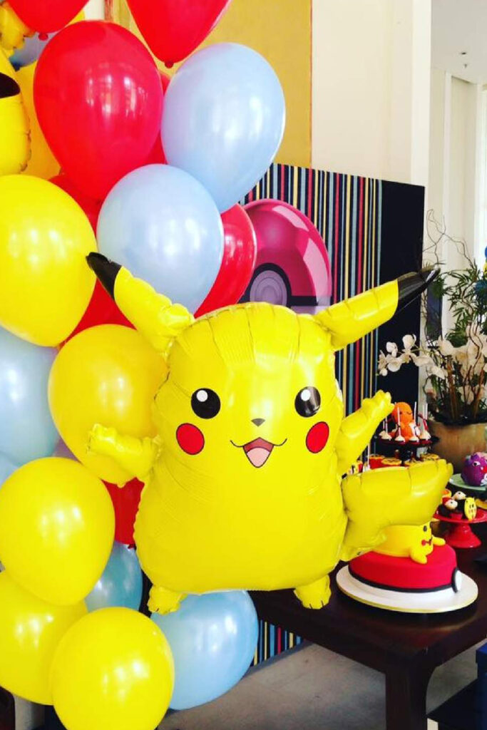 Decorate with red, white, and black balloons shaped like Poké Balls, mixed with Pikachu and Charizard helium balloons. Cluster around the party space for a vibrant, sky-high Pokémon vibe.