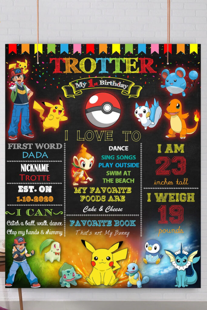 Design a chalkboard poster with Pokémon silhouettes and a “Welcome to the Pokémon Party!” message. Prop on an easel at the entrance to set the tone for a trainer-ready celebration.