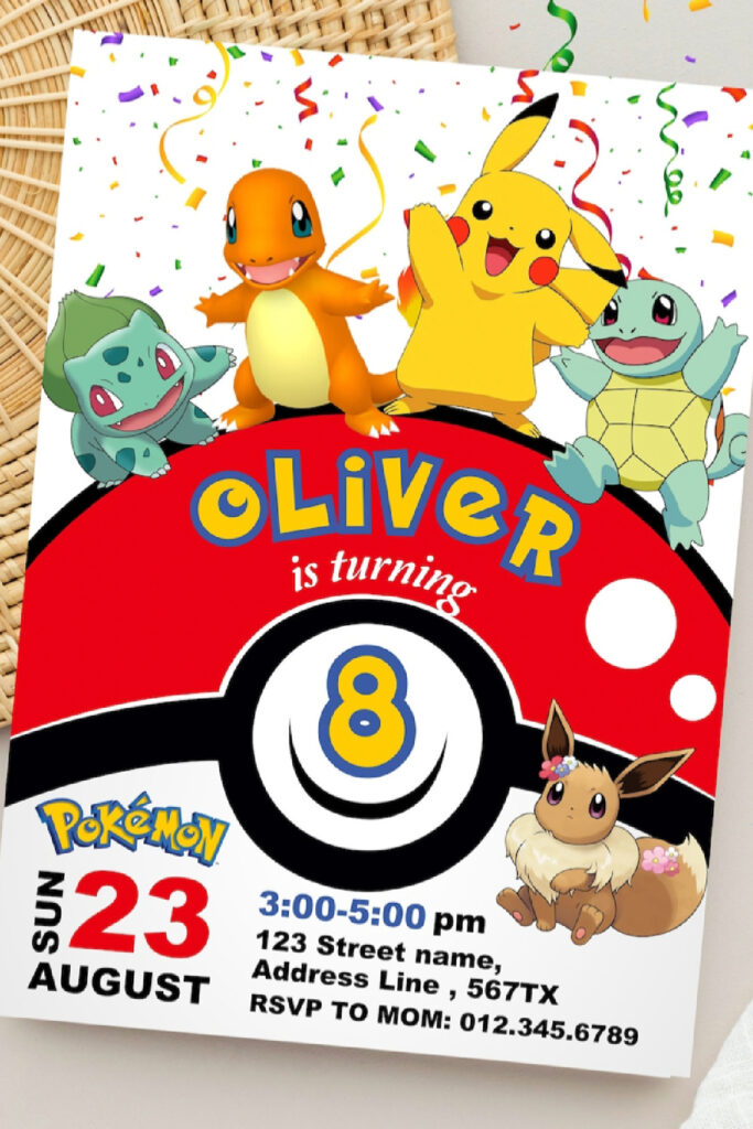 Design invitations with Pikachu or Poké Ball graphics, displayed as wall art or table props before mailing. Frame one with a “Join the Quest” sign to kick off the party theme.