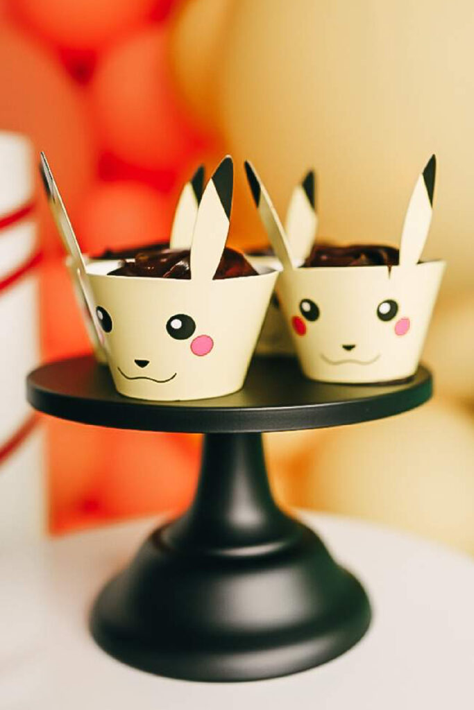 Wrap cupcakes in yellow Pikachu wrappers with printed ears and faces. Top with edible lightning bolts for a zappy, character-driven treat that electrifies the dessert table.