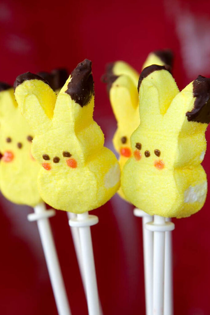 Make Pikachu-inspired peep pops by dipping marshmallows in yellow chocolate with candy eyes and red cheeks. Display on a stand with a grassy base for a cute, kid-friendly treat.
