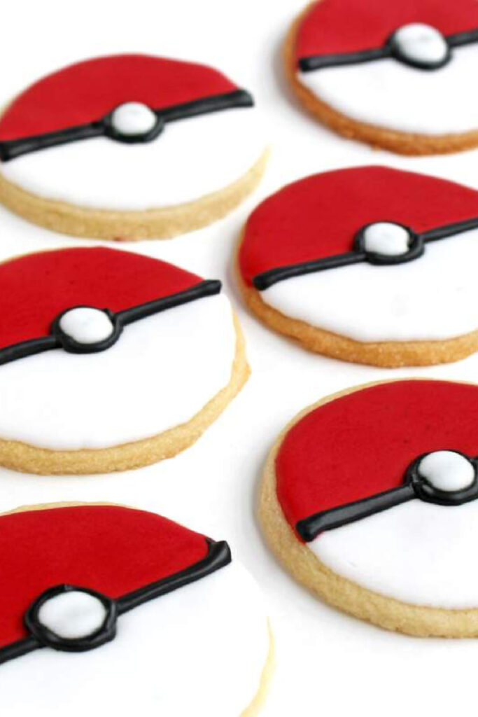 Bake round cookies iced to look like Poké Balls, with red and white halves and a black center. Display on a table with a “Catch ‘Em All” banner for a fun, thematic snack.