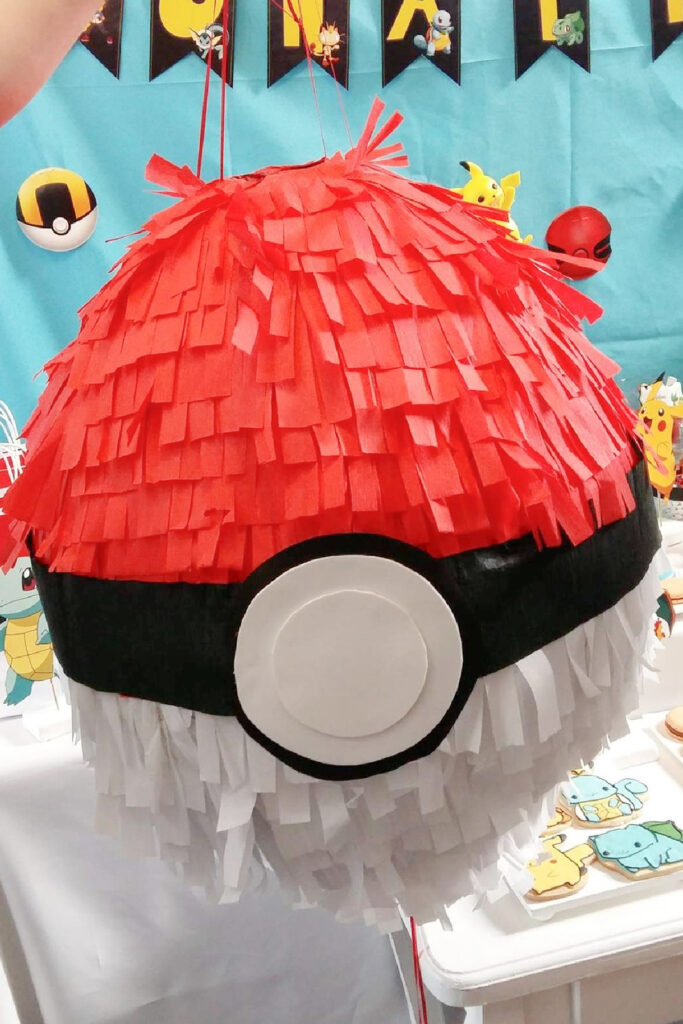 Craft a Poké Ball piñata from papier-mâché, painted red, white, and black. Fill with candies and hang in the party area for an exciting activity that doubles as a bold, thematic centerpiece.