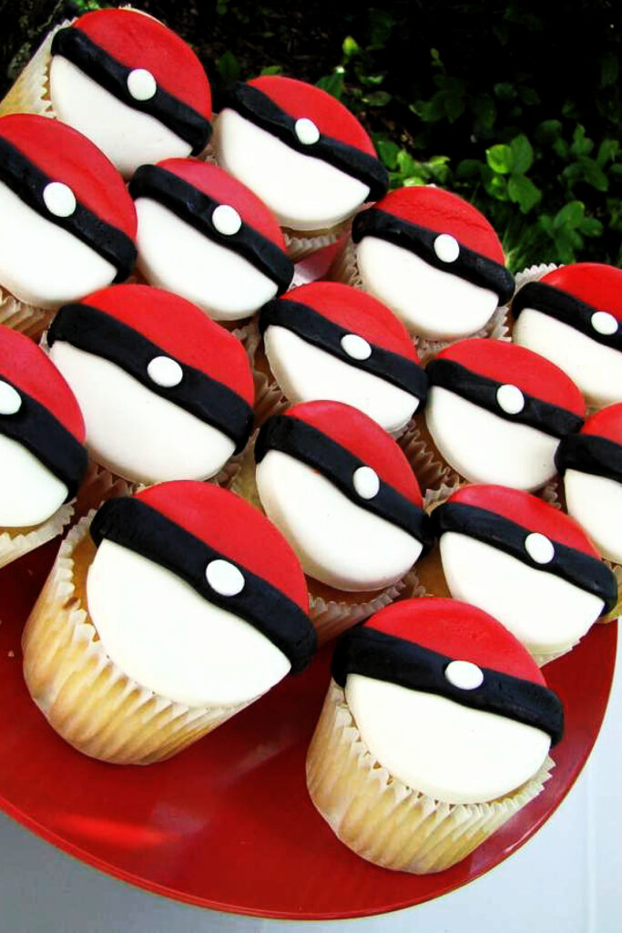 Bake cupcakes with frosting in Pokémon colors (red, blue, yellow) and character toppers. Display on a tiered stand with a Poké Ball base for a vibrant, thematic dessert focal point.