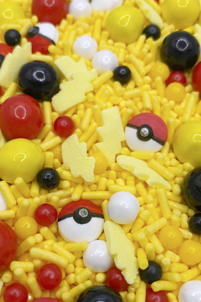 Decorate desserts with red, white, and yellow sprinkles inspired by Poké Balls and Pikachu’s colors. Display on a tray with a “Sweet Catch” sign for a playful, edible accent.