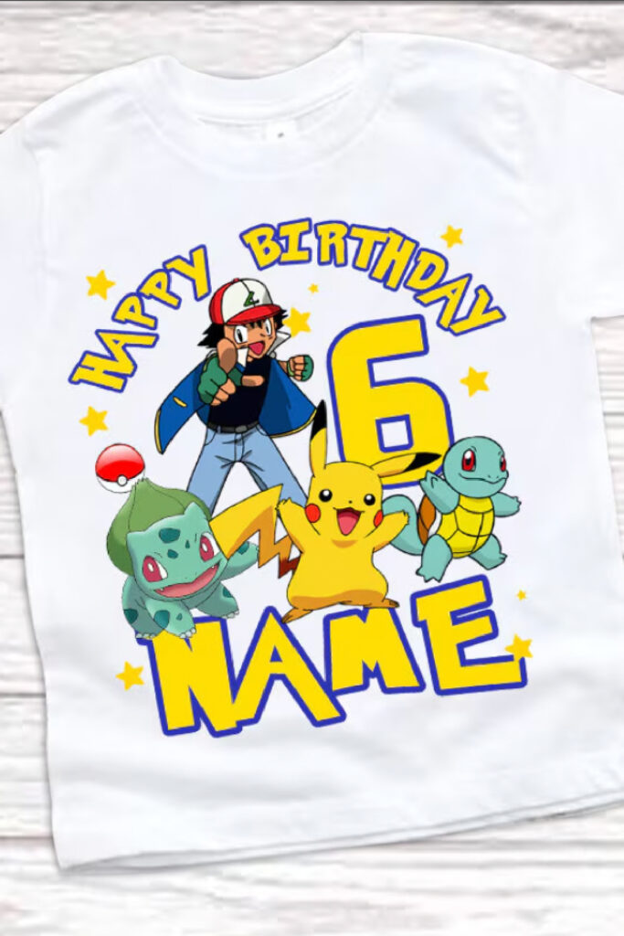 Gift the birthday child a custom Pokémon T-shirt featuring Pikachu or their favorite character, displayed on a hanger as decor. Hang near the entrance with a “Trainer HQ” sign for a fun, wearable accent.