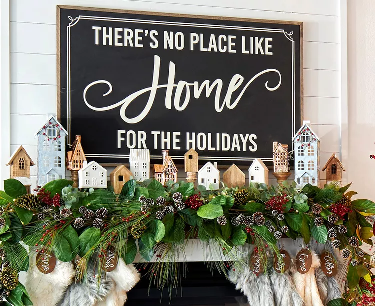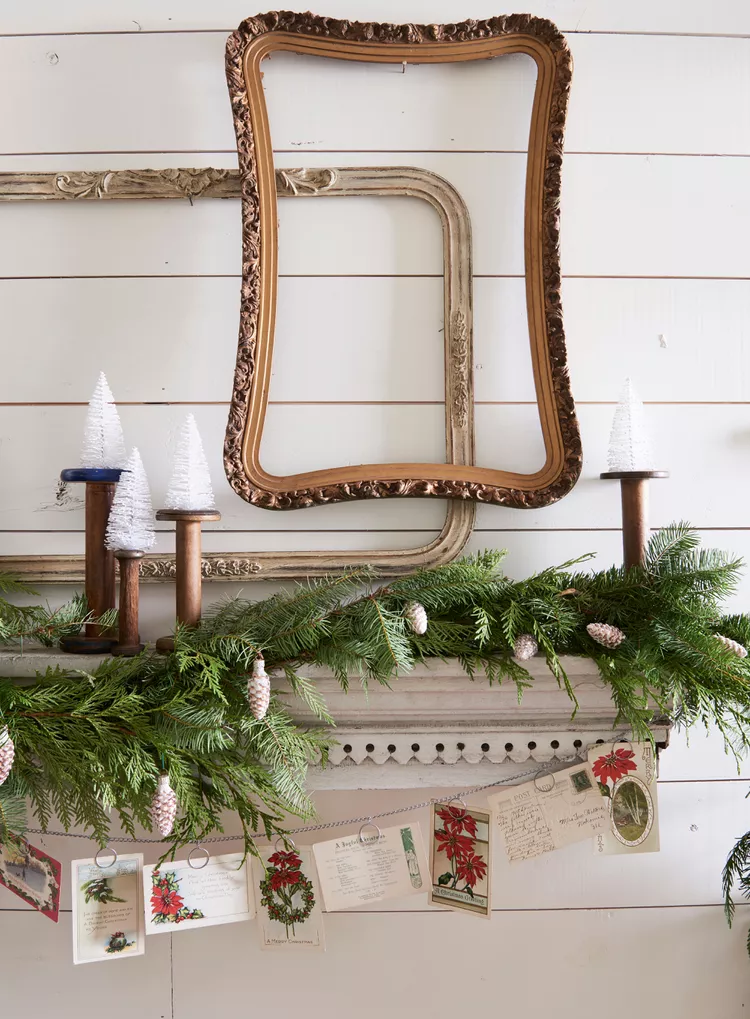 Hang a distressed antique mirror with a garland of holly and silver bells. Add a “Merry & Bright” sticker for a reflective, vintage Christmas accent.
