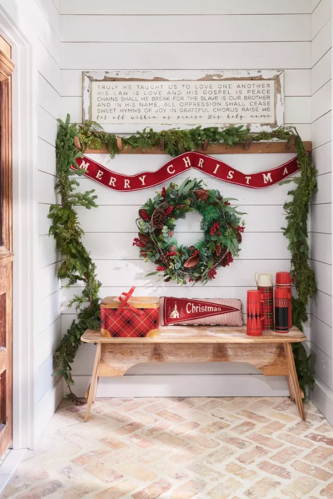 Hang a vintage “Merry Christmas” sign with red lettering and holly accents. Prop near the entrance with a tinsel garland for a warm, retro greeting.