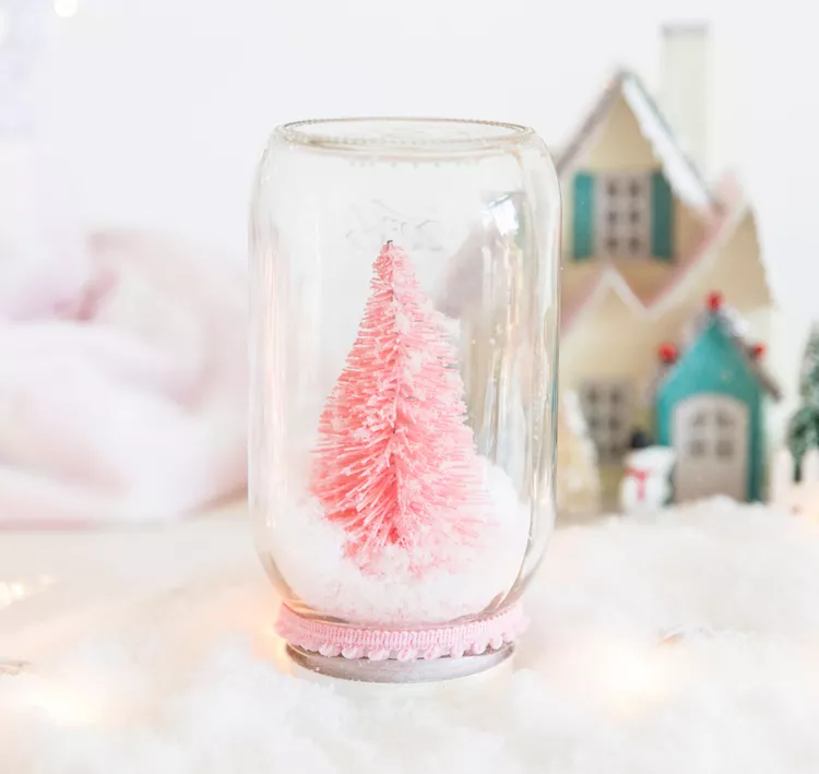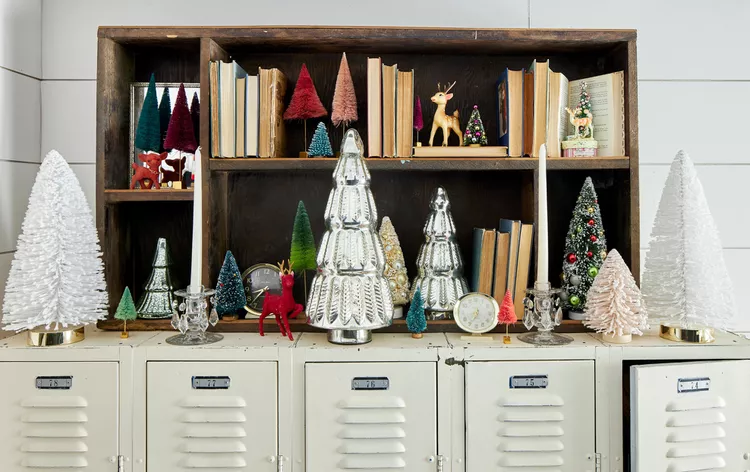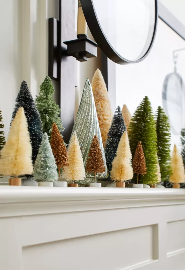 Create a mini forest of pastel bottle brush trees on a wooden tray. Sprinkle with faux snow and tiny lights for a retro, whimsical holiday display.