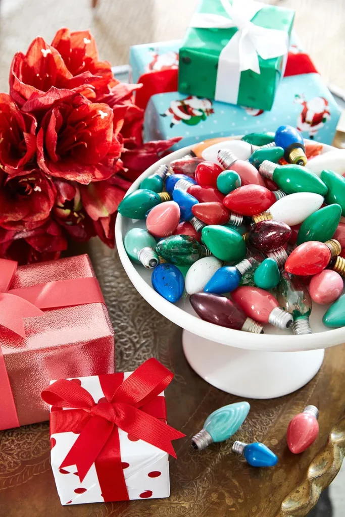 Drape oversized, colorful vintage-style bulbs across a window or porch. Pair with a red ribbon for a retro, festive glow that evokes mid-century holidays.