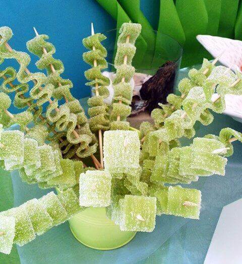 I twisted green licorice into seaweed-like strands and scattered them on the dessert table. They looked oceanic and tasted sweet. It’s a nice idea because they’re edible and budget-friendly, adding a colorful Bikini Bottom flair to a small party setup.