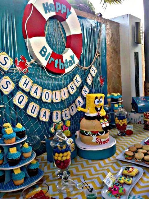 I baked a yellow cake with SpongeBob’s face, using icing for his square pants and smile. It was the party’s centerpiece. It’s a nice idea because it’s bold and fits any small table, capturing SpongeBob’s essence for a memorable birthday.