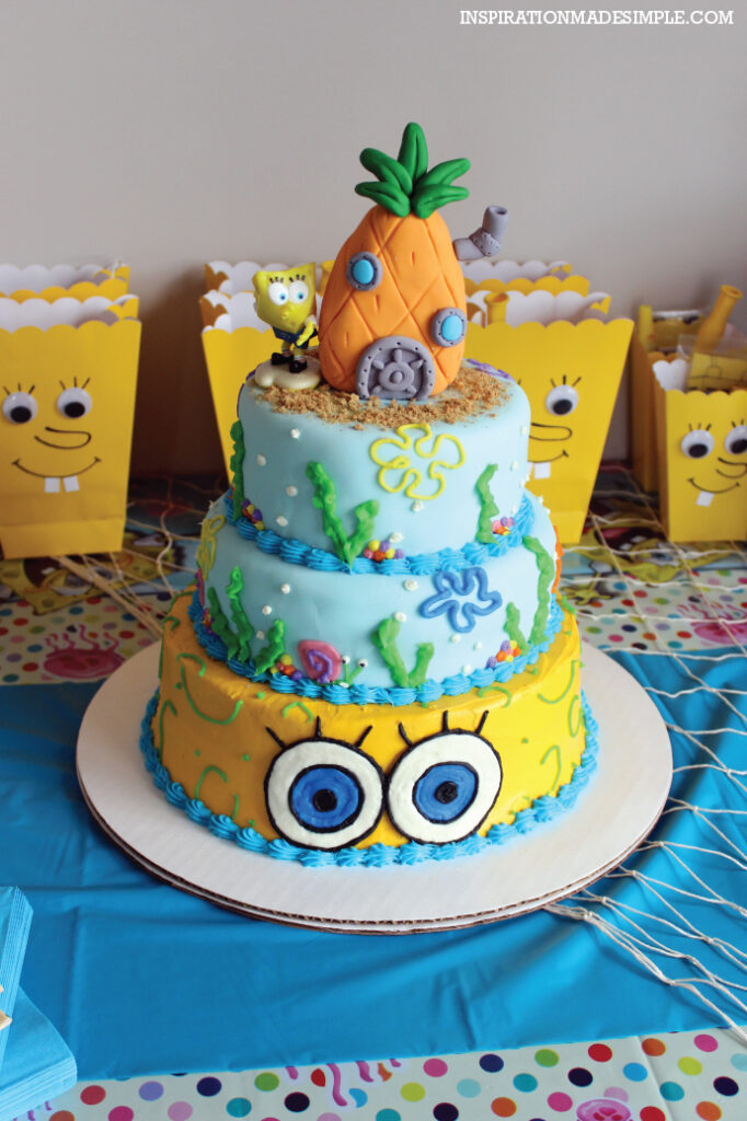 I created another SpongeBob cake with 3D fondant features for extra wow, complete with a tie and socks. It was stunning. It’s a nice idea because it’s a bold centerpiece, making a small table the heart of the Bikini Bottom party.