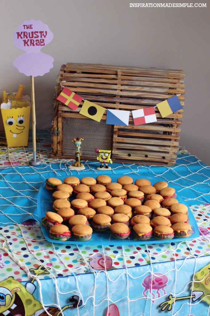 I served mini burgers as Krabby Patties with sesame buns and colorful condiments, mimicking the show’s iconic dish. They were delicious. It’s a nice idea because they’re fun and on-theme, turning a small food station into a Krusty Krab delight.
