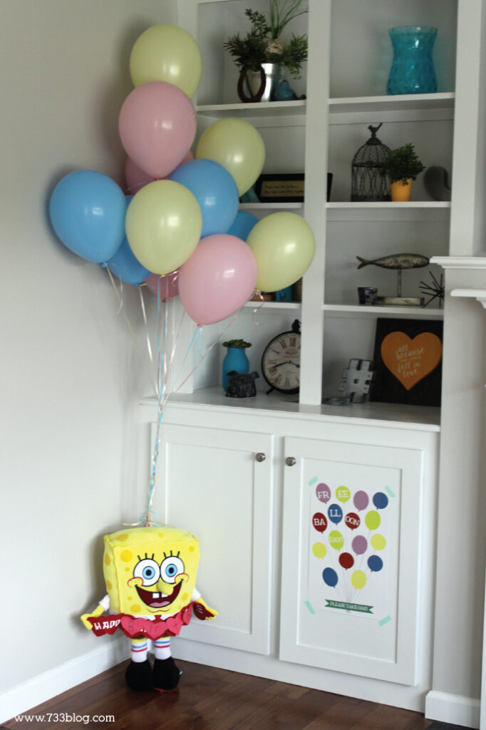 I made a sign reading “Free Balloon Day,” inspired by SpongeBob’s episodes, and hung it by the door. It set the mood. It’s a nice idea because it’s cheap and thematic, welcoming guests to a small space with Bikini Bottom spirit.