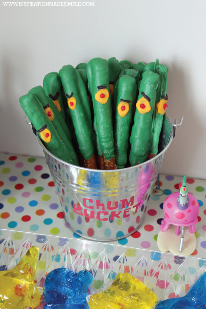 I dipped pretzel rods in green chocolate with a candy eye to create Plankton snacks. They were a fun treat. It’s a nice idea because they’re edible and budget-friendly, adding a villainous touch to a small snack table.