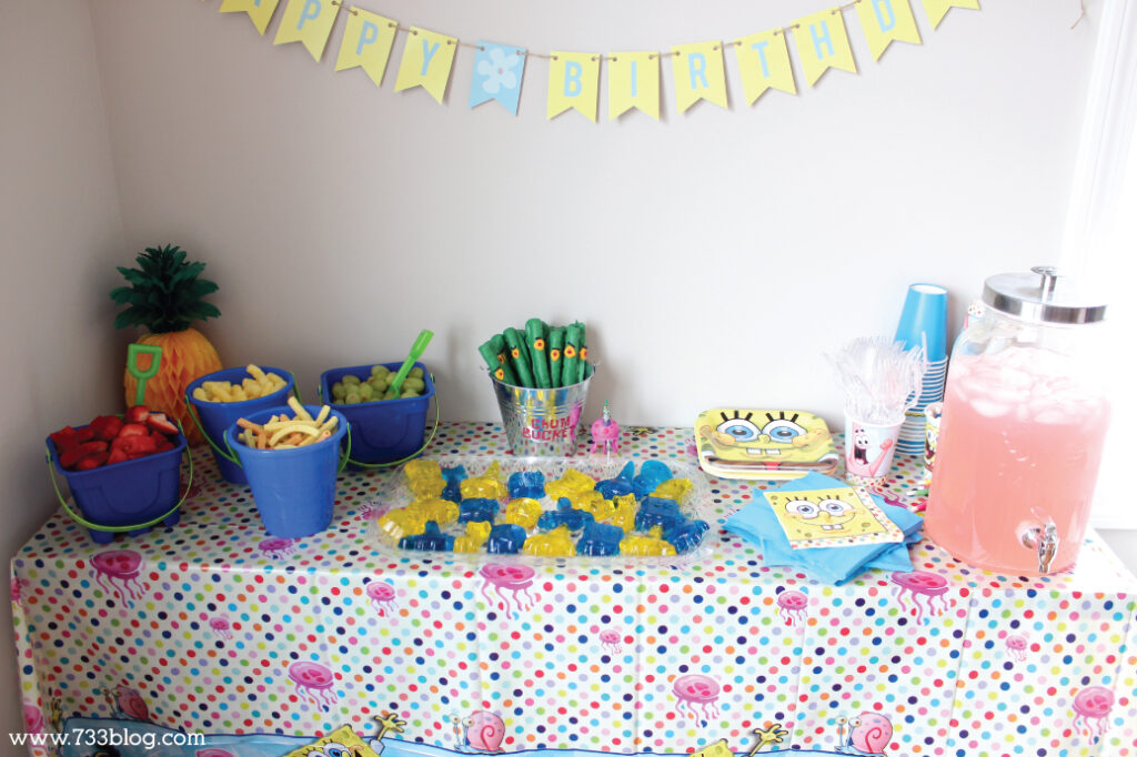 I set up a food table with blue tablecloths, coral props, and SpongeBob-themed snacks like fish-shaped crackers. It looked oceanic. It’s a nice idea because it’s cohesive and immersive, turning a small table into a Bikini Bottom buffet.
